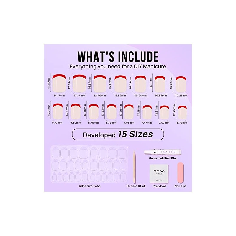 - What's Include: 15 nail sizes ensure a totally custom fit, plus we give you everything needed just in case! Each set comes complete with a storage box, nail glue, adhesive tabs, double-sided nail file, cuticle stick, and prep pad.