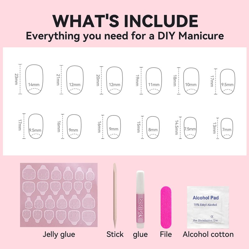- 【Complete Package】Each box includes 24pieces of press on nails short in 12 different sizes,along with 7 adhesive tabs and a nail. file - everything you need for a perfect manicure.