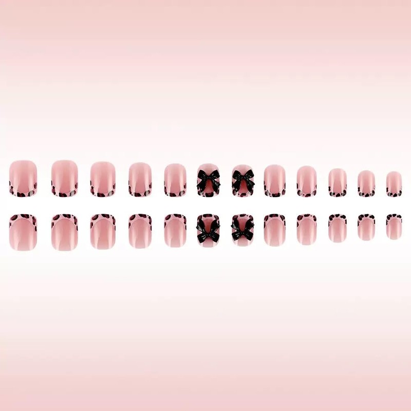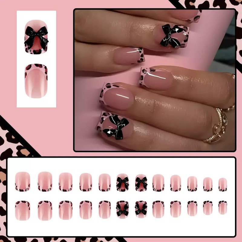 Short Press on Nails Square Fake Nails French Tip False Nails with Leopard Print Design Acrylic Nails 3D Bow Charms Glue on Nails Glossy Full Cover Stick on Nails for Women Manicure 24Pcs