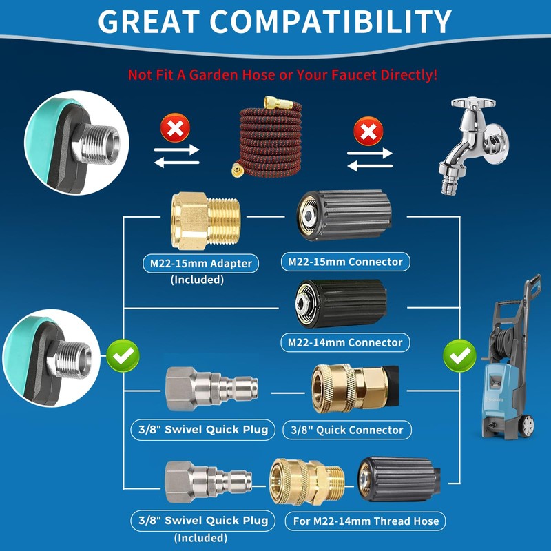 - ⭕WARNING:NOT COMPATIBLE WITH GARDEN HOSES, WATER HOSES, OR FAUCETS,MUST BE USED WITH A PRESSURE WASHER ONLY ! Pressure Washer Gun Is Suitable For M22-14mm / M22-15mm & 3/8" Quick Connecter