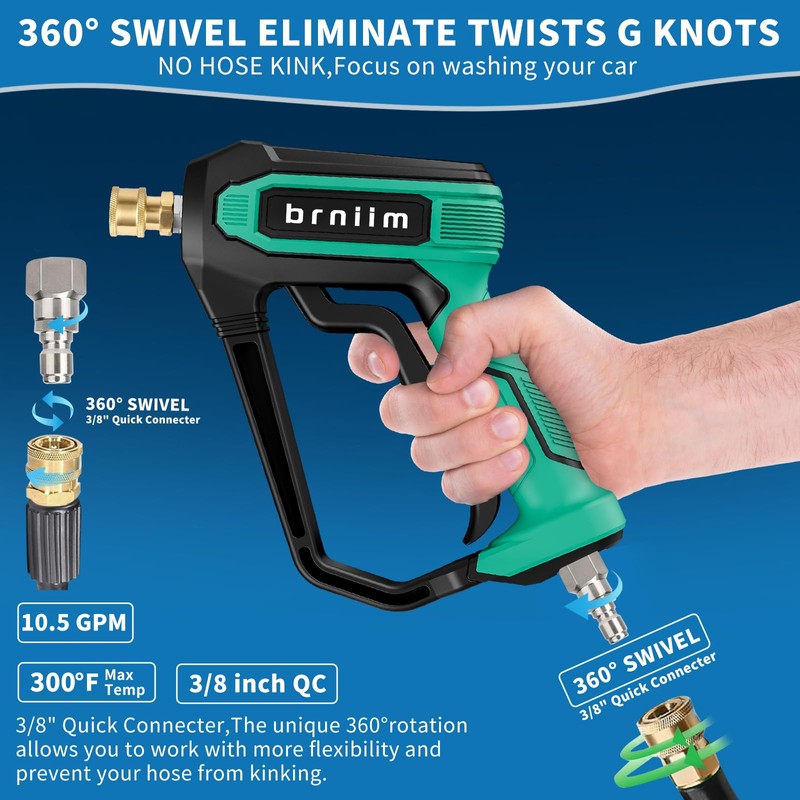 - Unmatched 360° Tangle-Free Swivel System: Experience effortless cleaning with our swivel pressure washer gun, featuring a built-in stainless steel bearing that allows 360° rotation to prevent hose tangles or twists—perfect for tight spaces like under cars or roofs. This high pressure washer gun swivel reduces operational resistance by 50%, ensuring swirl free washing every time