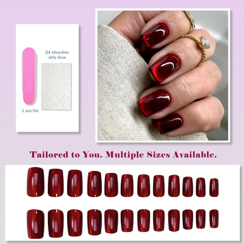 <strong>Ruby Jewel 24-Piece Cat Eye Press On Nails</strong> – Elegant Red Glitter Design for Instant Glam ✨<br><br> Elevate your manicure with our <strong>short cat eye press on nails</strong> featuring a luxurious ruby red glitter gradient and mesmerizing cat eye effect. These <strong>almond-shaped stick on nails</strong> bring salon-level elegance into your everyday routine—without the time or expense of a nail appointment.<br><br> 🌟 <strong>Key Benefits:</strong><br> <strong>24 PCS in 12 Sizes</strong> – Designed for all nail beds with natural fit and comfort<br> <strong>Cat Eye Glitter Gradient</strong> – Reflects light beautifully for a chic jewel-tone finish<br> <strong>Premium ABS Material</strong> – Lightweight, durable, odor-free, and reusable<br> <strong>Fast 3-Minute Application</strong> – No tools or UV lamp needed<br> <strong>Secure Adhesion</strong> – Included jelly stickers ensure long-lasting wear without lifting<br><br> 🦋 <strong>How to Use:</strong><br> 1️⃣ Clean and file your natural nails<br> 2️⃣ Select the correct size from 12 options<br> 3️⃣ Apply jelly sticker and press on <strong>short square false nails</strong> firmly for 15–30 seconds<br> 4️⃣ Optional: shape with included file for a custom finish<br><br> 💖 The deep wine red color and cat eye shimmer of these <strong>press on nails almond shape</strong> make them perfect for weddings, holidays, nights out, or any occasion when you want to feel glam. Their short length and tapered profile suit active hands while maintaining high style.<br><br> 🌿 <strong>Reusable & Comfortable:</strong><br> These <strong>fake nails short</strong> can be gently removed and reused with proper care. The curved base hugs your nail bed for all-day comfort, while the glossy finish resists fading and chipping.<br><br> 🎁 <strong>Perfect Gift Idea:</strong><br> Packaged beautifully, this <strong>acrylic press on nails</strong> set makes a thoughtful gift for birthdays, bridesmaids, or DIY nail art lovers. Enjoy flawless <strong>french tip nails</strong> in minutes—no salon required!<br><br> ✨ Add elegance to your fingertips with our <strong>short almond nails</strong> that combine trend-forward design and practical wearability for women on the go.