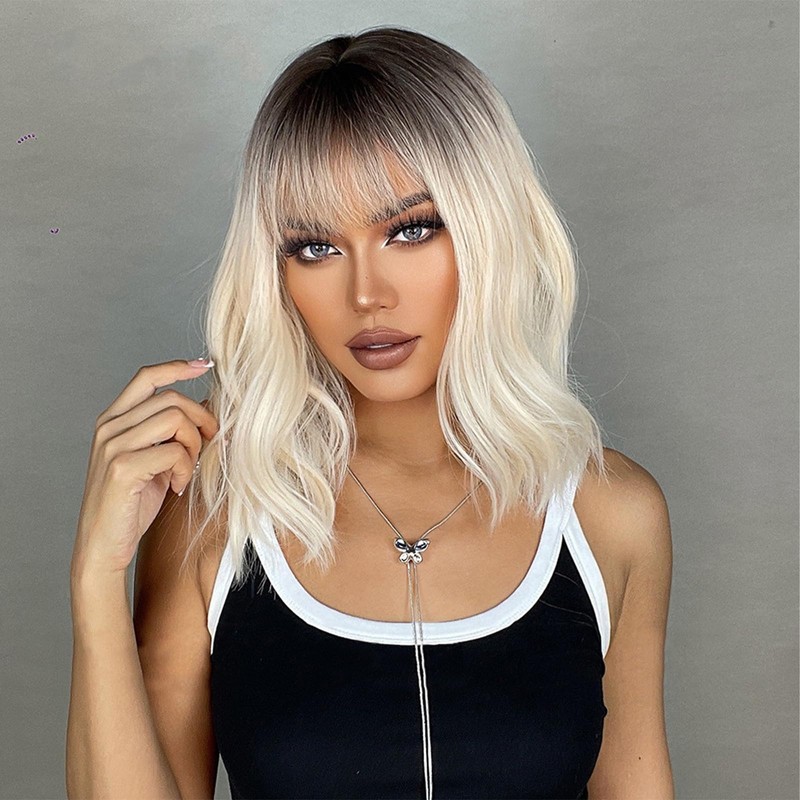 Short Wave Wig for Women, Ombre Shoulder Length Bob Wig Curly Synthetic Heat Resistant Ladies Lace Wig with Fringe for Girls Daily Use Party Cosplay(Blonde)