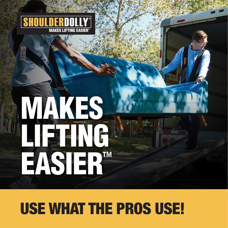 The ShoulderDolly gives you a hand in moving the heavy stuff--and reduces back, arm, and hand strain. This 2-person system was designed by a professional mover to ease the burden of lifting heavy and bulky objects. The kit contains two harnesses and one 12' long x 5" wide lifting strap. To lift an object, both people will slip the harness over their head, place the lifting strap under the object, squat to adjust the webbing for differences in their heights and the weight of the object, then stand up! The ShoulderDolly encourages safe lifting techniques and reduces the risk of injury. Eliminates damage caused by hand trucks and traditional dollies--no more marring walls, floors, doors, or furniture.The ShoulderDolly lifting system makes lifting big/bulky/heavy items easier! By using natural leverage, the ShoulderDolly Lifting System allows two people to maintain proper upright posture while lifting any heavy object. The ShoulderDolly works in conjunction with the muscle groups in your legs and shoulders. The sturdy harness fits comfortably over your shoulders and by using your legs, the ShoulderDolly significantly decreases strain and the risk of injury to your lower back, hands, biceps and forearms. Its a proven way to move big bulky items, safely, easily and more efficiently than a moving dolly. The recommended carrying capacity is up to 800 lbs, however, that is subject to the lifters ability. Each set weighs 4 lbs. One ShoulderDolly set includes everything you need for two people.