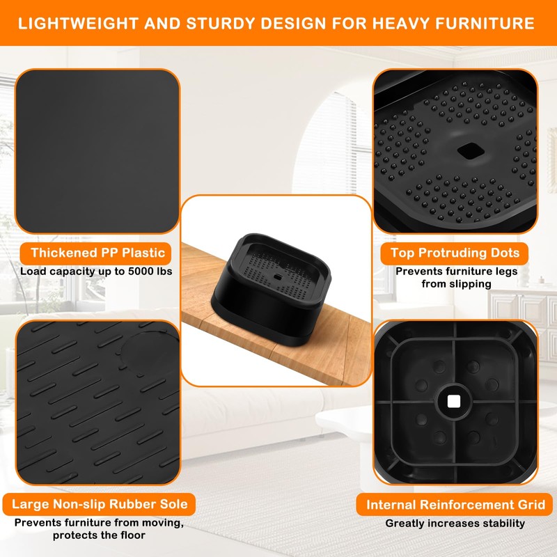 - 【Perfect for Heavy Slim-legged Furniture】Square bed risers makes adjustable furniture risers easy to match square or circle furniture legs. The bed frame riser is suitable for furniture legs smaller than 1.97"* 1.97", like bed, chair, desk, cabinet, sofa, table, TV stand, washing machine, refrigerators, etc.