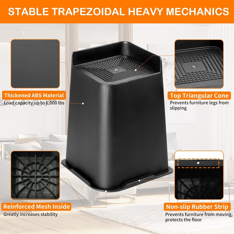 - 💪【Strong and Durable Material】The bed raisers are made of durable PP plastic material that can withstand the weight of the heaviest furniture in your home or office.The bed risers heavy duty can safely support a total of 6,000 pounds of weight, easily and stably holding your furniture in place.