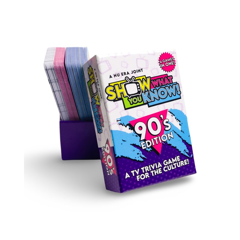 Are you ready to relive the magic of the 90s and prove you're the ultimate 90s TV expert?! From the mind behind the legendary Urban Trivia Card Game comes Show What You Know, a 4-in-1 trivia showdown that'll put your 90s TV knowledge to the ultimate test. Invite your crew over for a night of unforgettable fun and laughter. Act, guess, and cheer your way through countless questions about your favorite sitcoms, dramas, and reality shows. This game comes with stacks of trivia cards, each packed with challenging questions about unforgettable moments and iconic characters. With its sleek design and compact size, it's perfect for game nights, parties, or on-the-go fun. Grab your friends, dust off your 90s gear, and get ready to Show What You Know!