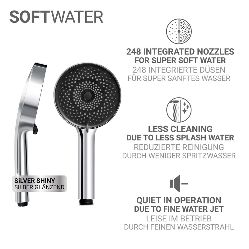 - Shower head: WENKO shower head diameter 12 cm for an incomparable shower experience with 248 micro-fine nozzles - gentle, low-splash water distribution and quiet function in chrome and black