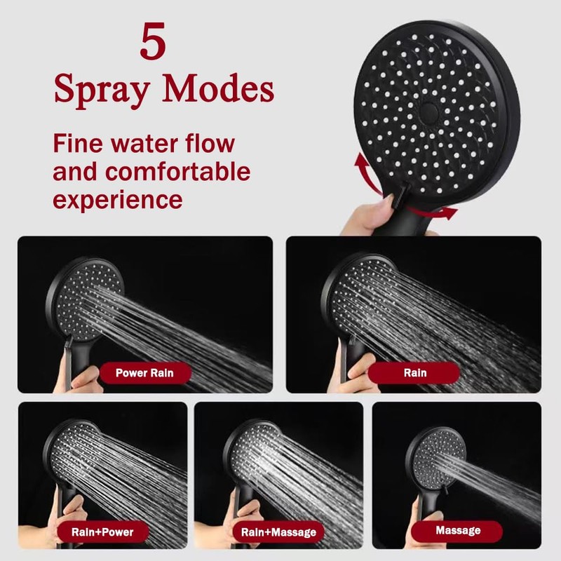 - Massage shower head rain shower with 5 jet types: spray, massage, power spray, power spray & spray, spray and massage. It is suitable for showering, head massage, baby bathing and pet bath, also suitable for bathroom cleaning. The unparalleled and all-round exciting shower experience is guaranteed to delight you