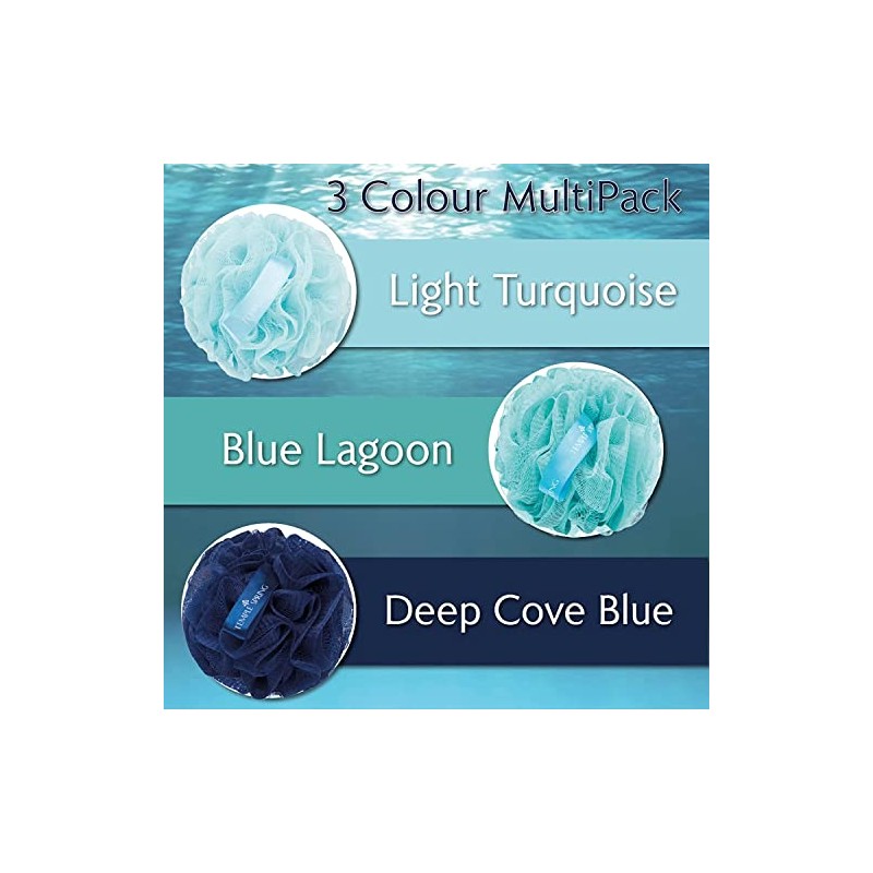 Shower Loofahs for Men - 3 pack Eco Recycled Shower Poufs and Skin Scrubber Set - Exfoliating Body Bath Scrunchies Sponges for Bathroom and Shower - Wash Loofah Puff Scrub Balls for Bathing (Ocean Blue)
