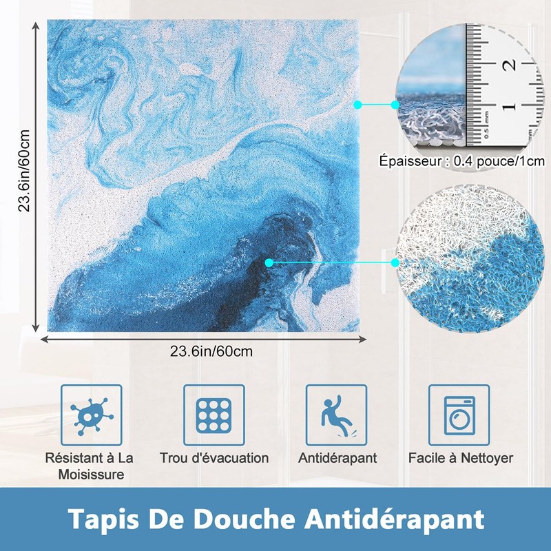 Shower Mat Non-Slip 60x60cm Navy Blue Square Loofah Bath Mat with Drainage Washable Shower Enclosure Bathroom Quick Drying