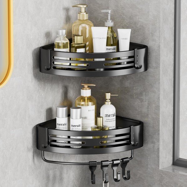 Shower Shelf No Drilling Bathroom Shelf for Storage Shampoo and Shower Gel, Black Shower Shelf Corner Bathroom Shelf Shower Basket with 8 Hooks for Bathroom Kitchen Toilet Pack of 2
