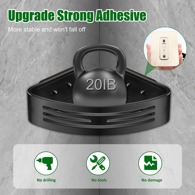 - STRONG TAPE The latest, improved, transparent, traceless adhesives ensure ultra-strong reliability with a load capacity of up to 40 pounds tested by professional institutions. Store the cans and bottles in the shower caddy and make them easy to reach and use. After proper installation, you no longer have to worry about falling objects.