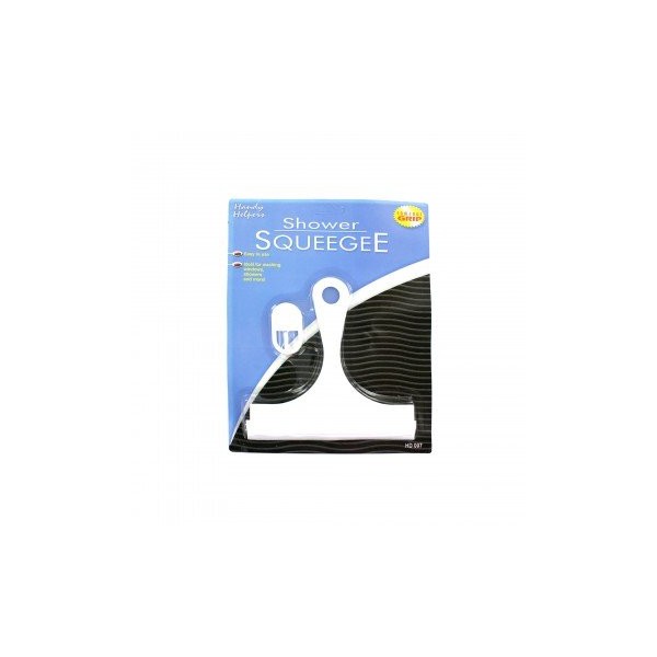 - Ideal for washing windows, shower doors and more, this Shower Squeegee is the perfect size for household use and features a comfort grip and convenient self-adhesive hook that helps keep squeegee within reach. It is made of durable plastic with a rubber blade. Each squeegee measures approximately 6" wide and 6.25" long. Comes packaged in a blister pack.