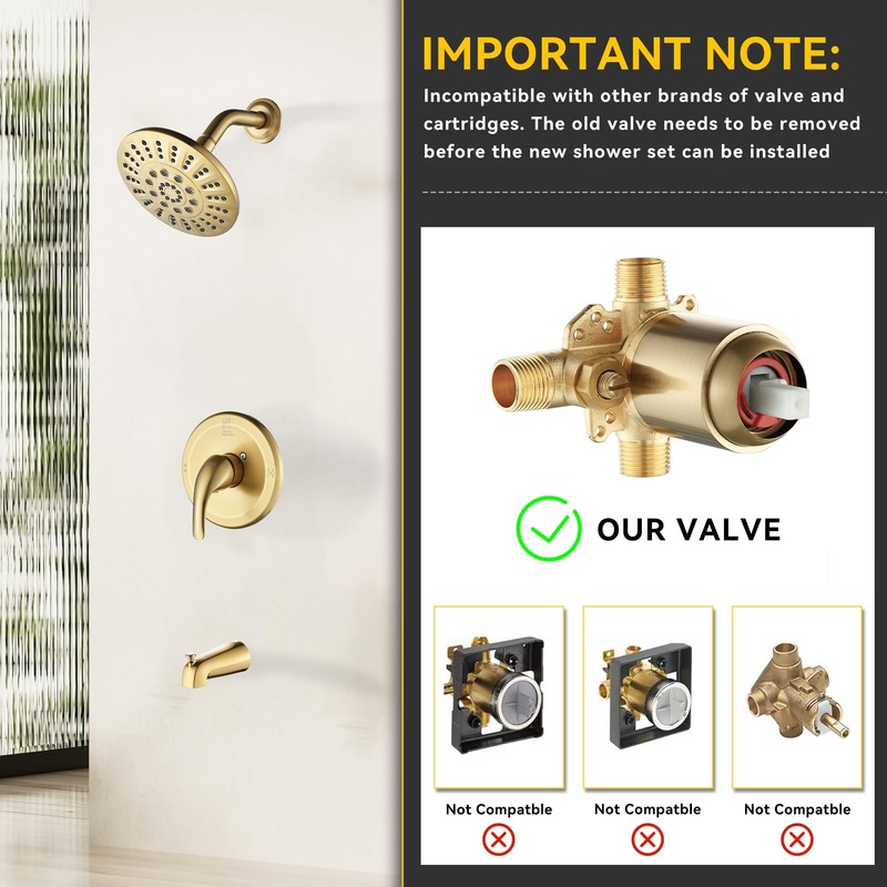 - Superior Quality: The brushed gold shower tub kit with valve is made of solid pressure balance brass, which will not break or leak in extremely hot or cold environments, ensuring strength and durability