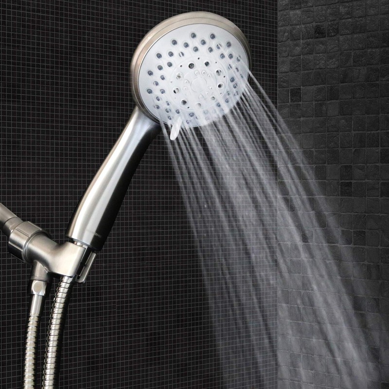 - HEAT RESISTANT SOLID ABS CONSTRUCTION HANDHELD SHOWER HEAD WITH LONG STAINLESS STEEL HOSE 70 inch STRETCHABLE TO 80 inch – ShowerMaxx all-inclusive showerhead kit includes everything our customers need for hassle-free installation. Each Hand Held Shower Head kit comes with Heat Resistant Solid ABS Handheld Unit, Solid ABS Mount, Long Stainless Steel Hose, Pre-Installed Flow Restrictor and fitted Mesh Sand Filter Disk! Complete with step-by-step installation guide – and free Teflon tape.
