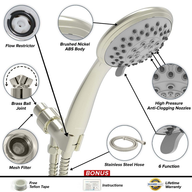 ShowerMaxx, Choice Series, 6 Spray Settings 4 inch Hand Held Shower Head, Extra Long Stainless Steel Hose, MAXX-imize Your Shower with Handheld Showerhead in Brushed Nickel Finish