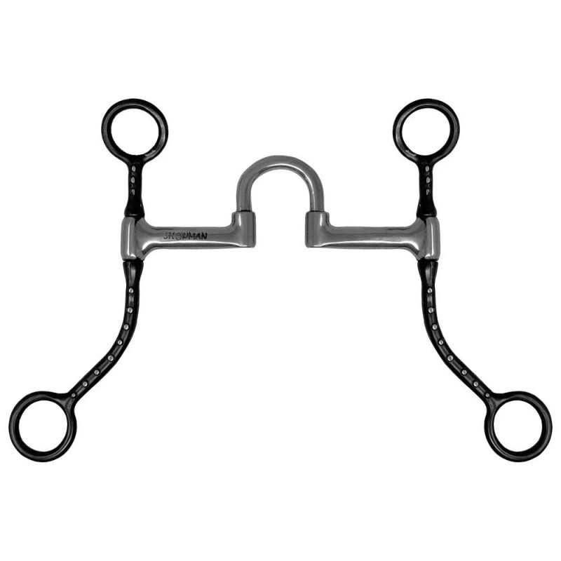 Showman Western Short Shank Correction Bit w/ Silver Dots. This short shank correction bit with silver dots is a type of bit used in horse riding designed to provide a corrective pressure on the horse's mouth and encourage it to respond to the rider's commands. The bit features a short shank, which means that the lever action is minimal and makes it a gentler option than other correction bits. The silver dots help the rider to maintain a more consistent and effective contact with the horse's mouth, which can improve the horse's responsiveness and overall performance. Each side of the bit can be worked individually while schooling and is effective at teaching horse's to flex at the poll and lift at the shoulder. Experience the craftsmanship of a handcrafted Showman bit - each component is expertly welded, formed and ground by hand.