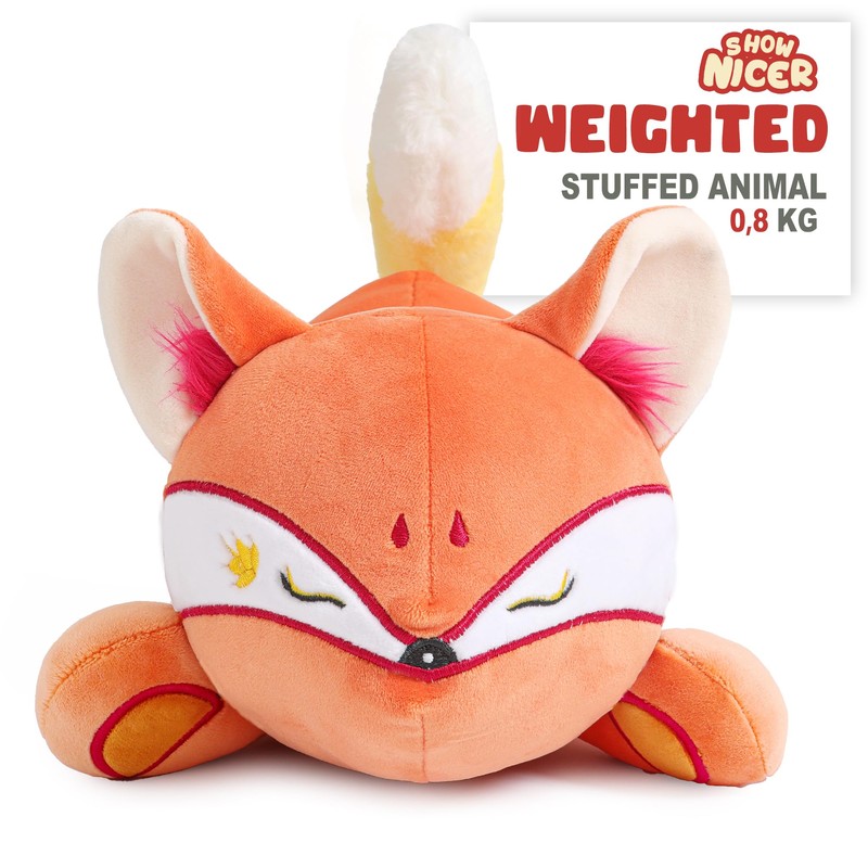 - Weight cuddly toy fox: weight: 0.82 kg. Size: 35 cm. The weight animals fox are a suitable size, its abdomen are filled with weighted beads that makes it perfect for cuddling or relaxing.