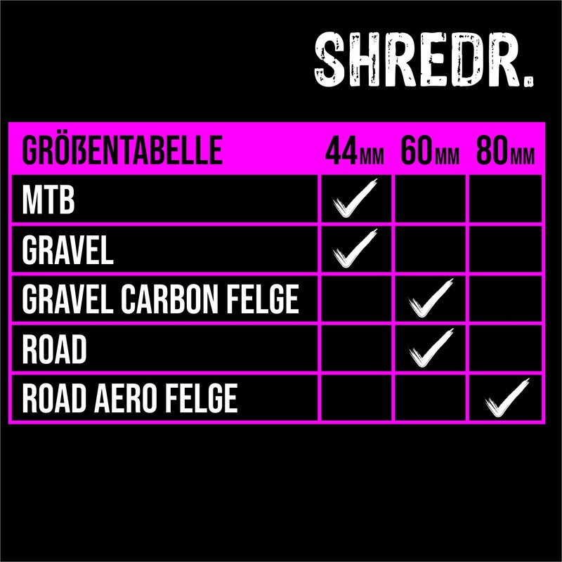 - Suitable length - The 44 mm length fits perfectly for normal mountain bike rims, the longer 60 mm version fits well for slightly higher rims e.g. for road bike or gravel. - 80 mm is suitable for road bike aero rims.