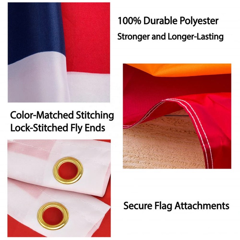 - CRAFTSMANSHIP: Made of durable polyester. Double-stitched all around the edge and strengthened by canvas header and two brass grommets. You will fully appreciate the craftsmanship and quality of this flag.