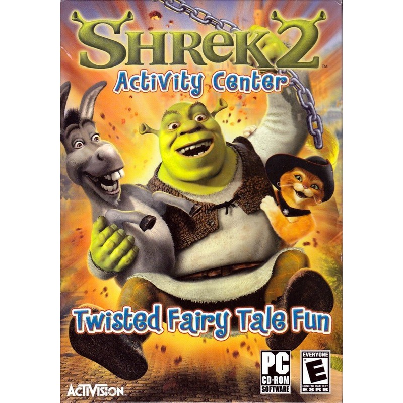 Shrek 2 Activity Center Twisted Fairy Tale Fun  New & In Stock  It's time to join Shrek and his friends for fairy tale fun with a twist in a land far far away!  There's plenty of fun and learning to be had with Shrek and his pals as you embark on activities based on actual scenes from the movie!  Features:  3 unique levels of difficulty will encompass a broad range of ages for each activity. Join Shrek and his friends including : Puss In Boots, Princess Fiona, Donkey, Gingerbread Man, King Harold and many other in this action-packed Activity Wonderland. Awesome activated including: Dinner with the King, Careening Carriage, Fairy Godmother's Lab and many others that will keep you smiling, challenged and playing for hours. Play hide & Go Seek with Shrek and his friends! Help Shrek with his table manners in "Dinner with the King"Catch Puss in Boots before he gets you!   Rated "E" Everyone CD-Rom forWindows XP/2000/Me/98
