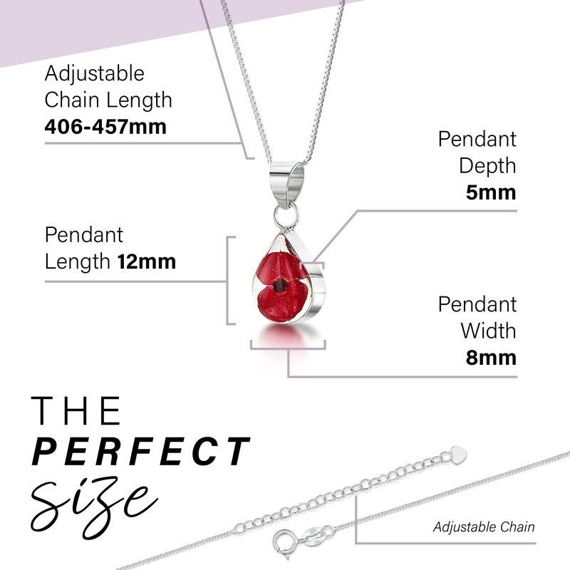 - FASHION JEWELLERY: Features a beautiful small, red poppy in a necklace to wear. Tiny, perfect flowers are dried and encapsulated in a teardrop-shaped pendant necklace. This gives the illusion they're floating in glass, but is much more durable for an everyday necklace.
