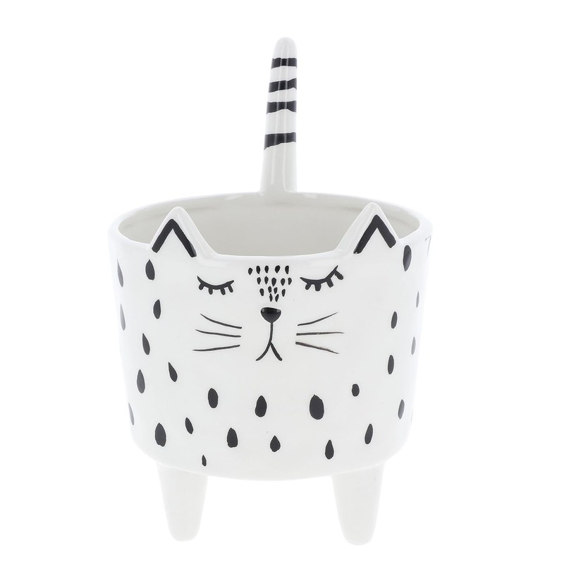 - CAT: Each pot is in the shape of a cat’s body with facial details including whiskers, ears and a smiling face. The cat’s body is white with black spots and fits a plant in the body of the cat.