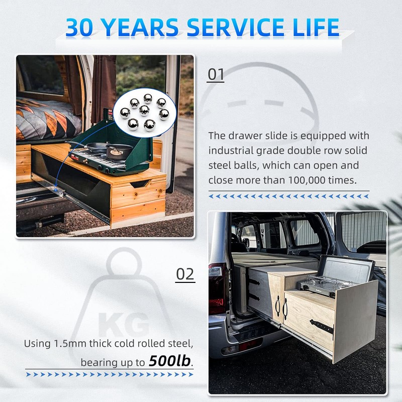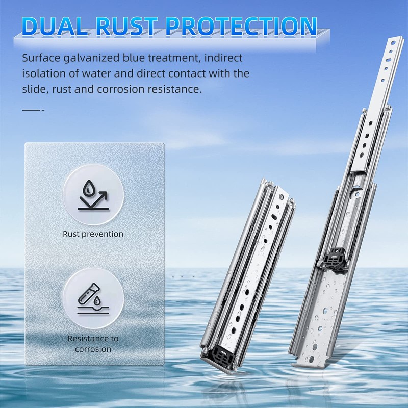 • 【Double Anti-Rust & 30 Years Service Life】— Zinc Plating finish for anti-rust which is twice the traditional ordinary slide. After professional institutions testing,the load open-close cycles times reached 100,000 times.