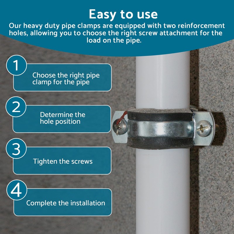 - Wide range of applications: including plumbing, electrical and exhaust systems, can be used to secure stainless steel pipe, PVC pipe, shed posts, fences, etc. to wood, concrete and other surfaces that require fastening.