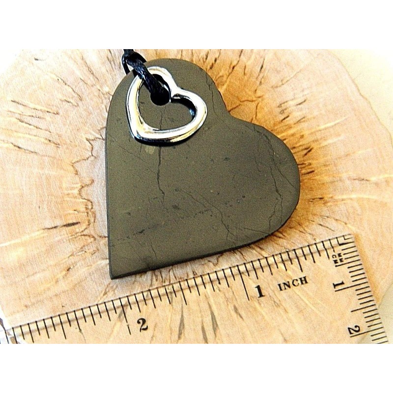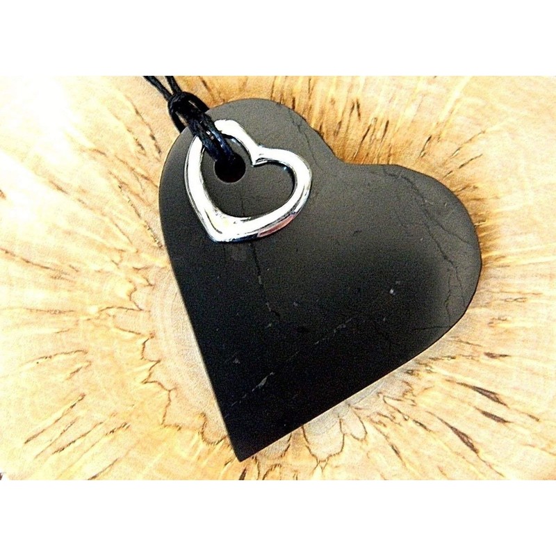 Shungite pendant ''Heart'' weight about 12g. Small heart is made of metal (zinc alloy).Color: silver In the complete set a black waxed thread ( diameter 1mm).