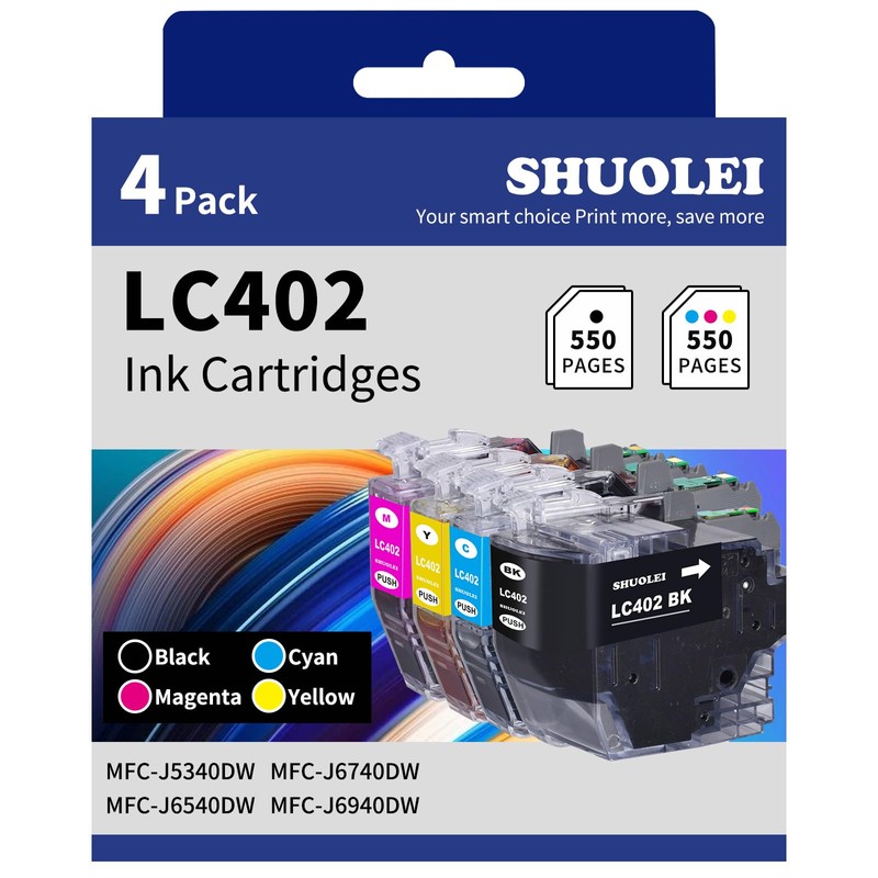 • 【High Page Yield】 Up to 550 pages per LC402 black ink cartridge, 550 pages per LC402 Cyan/Magenta/Yellow cartridges (with 5% coverage of A4 paper).