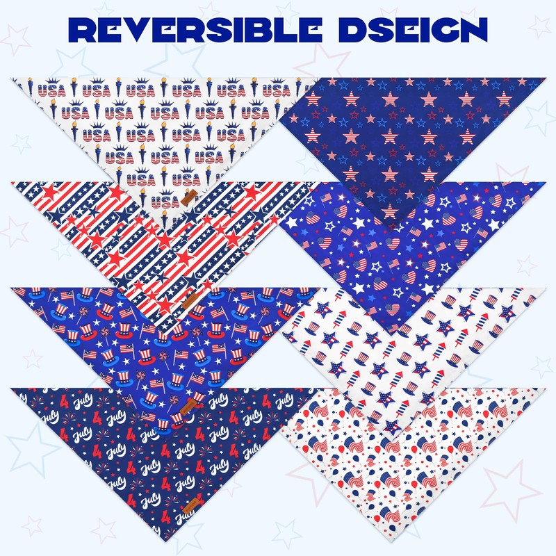 - 【Double-Sided & Reversible】Each bandana presents two fashionable patterns, providing your pup with 8 distinct looks in one set - an excellent value and variety for your furry companion! It includes 4 reversible dog bandanas, each showcasing unique American flag-inspired designs, which are perfect for celebrating Independence Day, Memorial Day, and other patriotic occasions.
