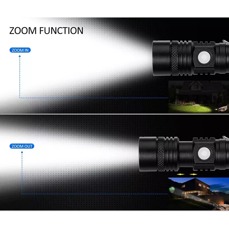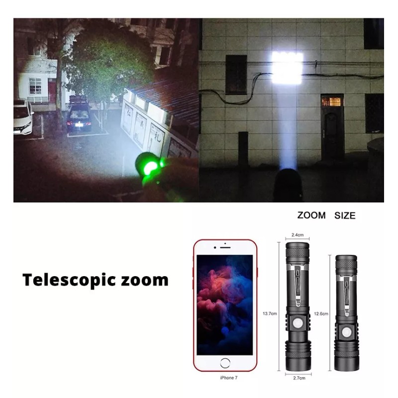 1. Ilumina fácilmente una habitación entera o enfoca objetos a una distancia de hasta 300 m! 10 veces más brillantes que las antiguas luces incandescentes. Cuenta con función de zoom para mayor concentración de luz.