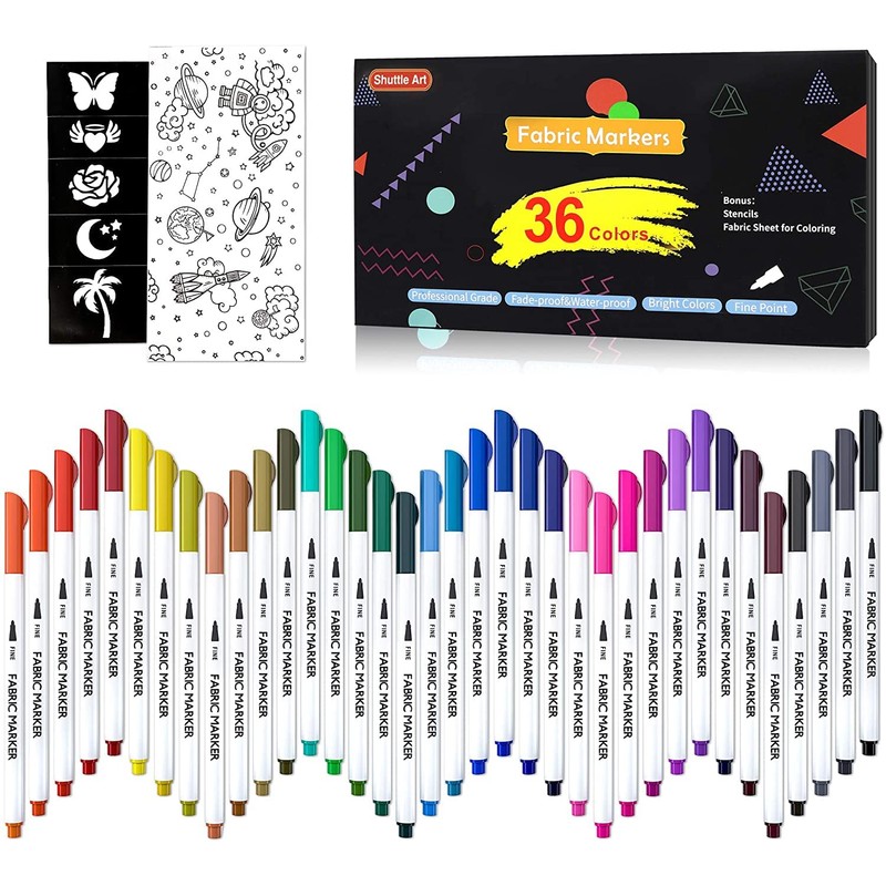 Shuttle Art 布用ペン 36色セット ファブリックマーカー 布に書けるペン 水性 速乾 耐水 耐久 ウォッシャブル 洗っても落ちない 色褪せしにくい ステンシル付き DIY ハンドメイド 手作り イラスト 落書き スニーカー Tシャツ カンバス 子供