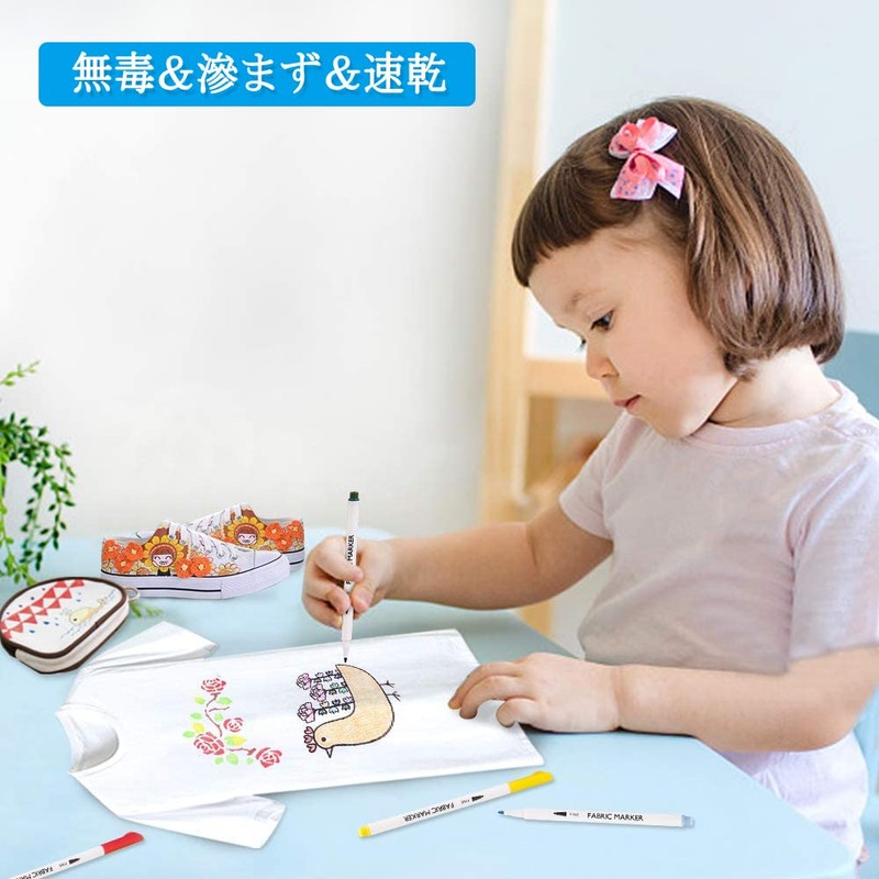 - 【様々な用途】お子様の持ち物の名前書いたり、オリジナルTシャツを作ったり、またジーンズ ・ハンドバッグ・ハンカチ・スニーカー・枕カバー・キャップなど日常で使っている物にお好みなイラストを描けます。◎布の種類によりにじみ方が違いますので、事前に試し描きをして確認してください。ご使用後は、キャップをしっかりしめて横置きに保管してください。