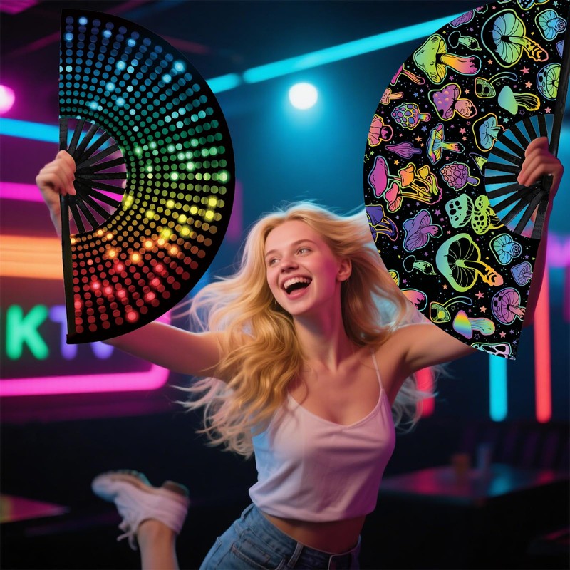 Durable and lightweight: Not only is this fan eye-catching, but it's also practical and fun. With a larger size than most hand fans, it's great for creating an even bigger impact at raves, music festivals, and other events. Made with a sturdy bamboo frame, this fan is durable and lightweight, making it easy to carry with you wherever you go.Whether you're using it to stay cool in a hot and crowded dance floor or simply as a decorative accessory, this hand fan is both practical and fun, making it a great gift for anyone who loves to party
