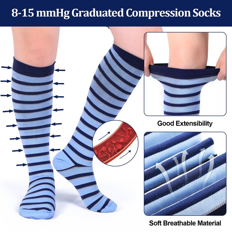 • Material: 8-15 MmHg Graduated Compression Socks are made of materials such as cotton and nylon, which are reliable, soft, elastic, skin friendly, and breathable; They provide 360 degree stretching for greater flexibility and durability; The socks can stay in place without wrinkling or slipping, and the breathable high-performance fabric can maintain optimal temperature