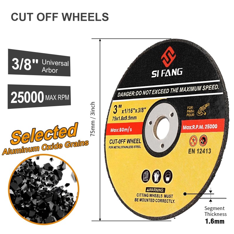 • COMPATIBILITY -- SI FANG 3 inch cut off wheel Be equipped with the 1/4in mandrel for die grinder with two different types of thread head fit most drills and die grinder, the chuck type 3/8" and 1/4" arbor construction also can be used for mounting any other various type cutting discs and cutoff wheels, Revitalize your toolbox for new experiences.