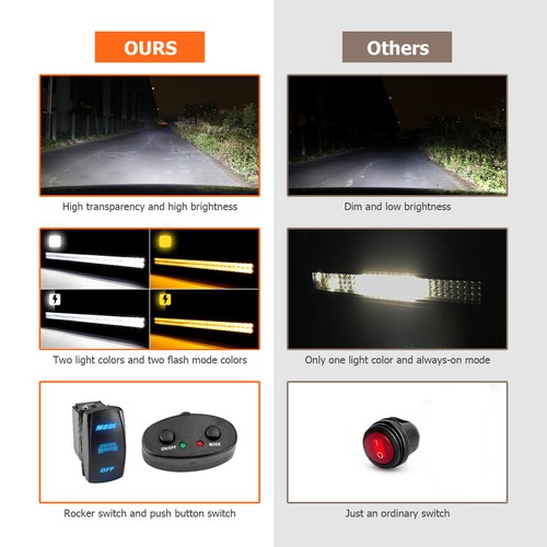 The 32"LED light bar has 4 lighting modes and a memory function design. Lighting modes include white light, white strobe, amber light and amber strobe. Used for low visibility and emergency situations as auxiliary lights, warning lights, and fog lights. The memory function allows the light bar to be turned on again in the mode it was last turn off in, so you don’t have to adjust it again.