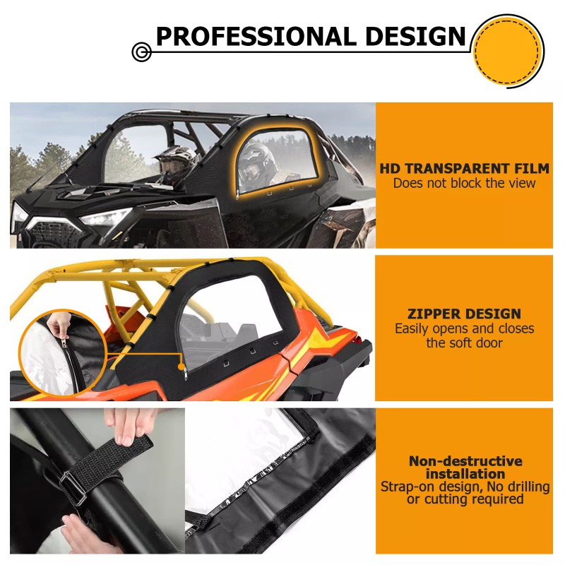 Our UTV all-weather soft upper door window can be opened and closed by zipper lock and two straps, it can be folded for easy storage. The center is made of PVC high-definition transparent film, which will not block the view of the cab. It not only enhances the look of your vehicle but also creates a more comfortable and enjoyable driving experience.