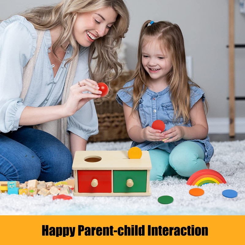 - This simple yet effective learning toy is designed to promote motor skills, matching skills and other important Montessori activities through easy-to-follow movements. The pack contains 1 wooden box with 2 drawers, 5 coins and 1 ball.