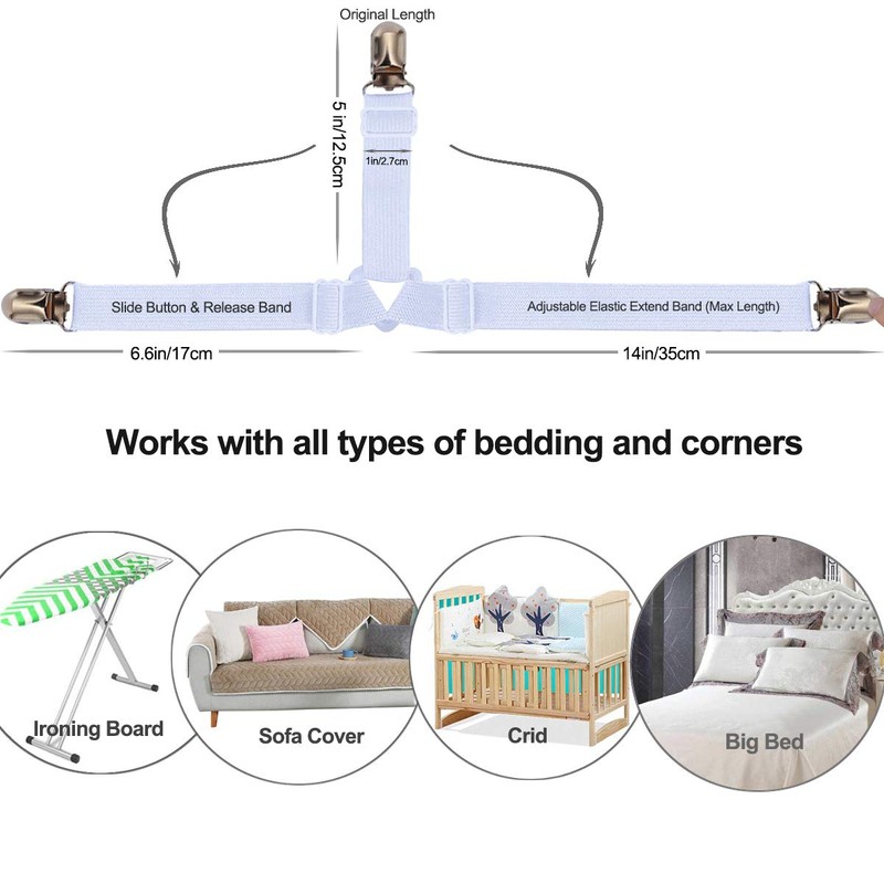 Multiple Application Our adjustable sheet holder elastic straps works with fitted or flat sheets(including size from Twin up to California King sheets), Also can be mattress pads clips, tablecloths holder, blankets grippers, cars seat cover clips,grill covers suspenders,boats seat cover holder, motorcycle seat cover grippers, scooters seat cover fasteners, couch seat cover suspenders , chairs seat cover fasteners,even ironing board covers fasteners straps and more.