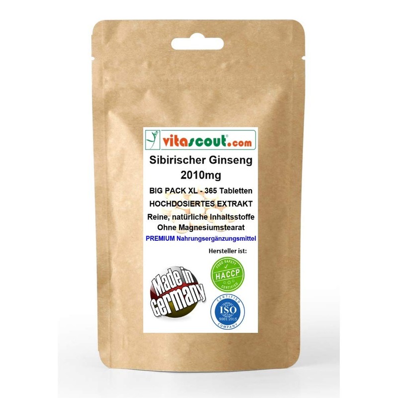 Siberian ginseng extract corresponds to 2010 mg powder per tablet, made in Germany, 365 tablets, without magnesium stearate, laboratory tested.