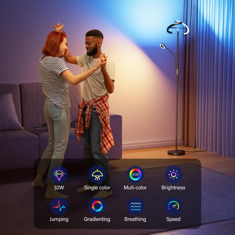 - UPGRADED RGBCW Floor Lamp with Reading Lamp -- new version rgb floor light, 32W, super bright; 3 lighting modes (white & warm; RGB; reading), while single color mode & dynamic mode available, perfect for parties, games, or any occasion. The ring lamp is specially designed for reading.