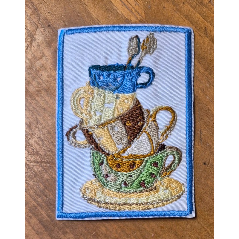 The product is an embroidered patch featuring stacked coffee or tea cups. It is designed for sewing or ironing onto various items such as bags, clothing, and crafts. The patch is suitable for adding a decorative touch to accessories and apparel. Made by SIC Custom Sewing in the United States.