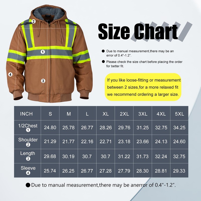 - 【Hi Vis Winter Jackets】The shell material of the high-visibility winter jacket is made of 100% cotton canvas with an added waterproof agent, while the lining is 220g comfortable cotton fleece. Every part of the lining is filled with lamb's fleece. In winter, this reflective jacket will protect you from the cold.