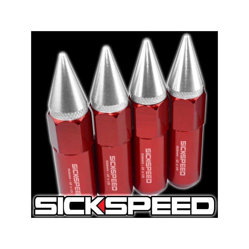 SICKSPEED 4 PC RED/POLISHED SPIKED ALUMINUM 60MM LUG NUTS WHEELS/RIMS 12X1.5 L02