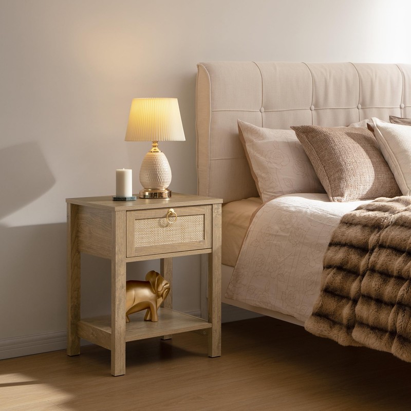 - 【Ample Storage Space】The nightstand has an 11 inch deep rattan decorated drawer and open shelves that provide ample storage space. The surface of the side table is large enough to place a table lamp on it, as well as remote controls, cups, magazines, etc. ideal for your bedroom and living room, making the space more tidy and orderly.