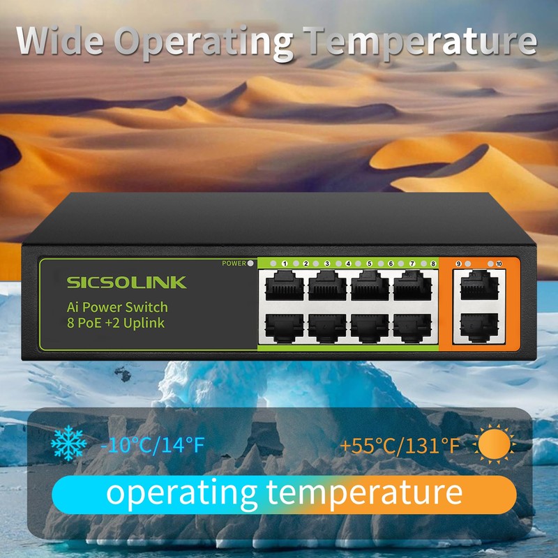 SICSOLINK SICSOLINK 8 Ports PoE+ Ethernet Switch, 2 Uplink, 802.3af/at, 120W Total Power, 100Mbps Network Hub, 20 Gbps Switch Capacity, Unmanaged, Plug & Play, Suitable for IP Cameras, Home & Office.